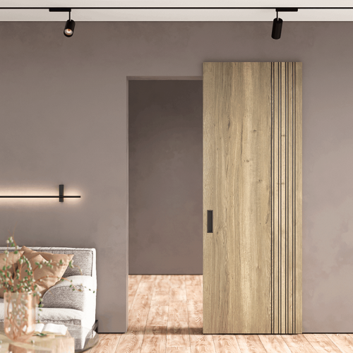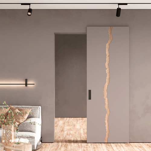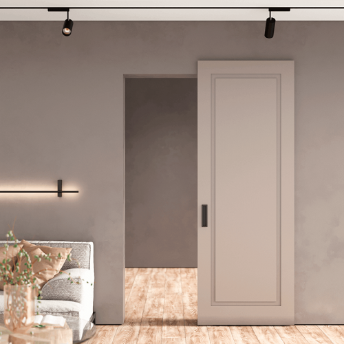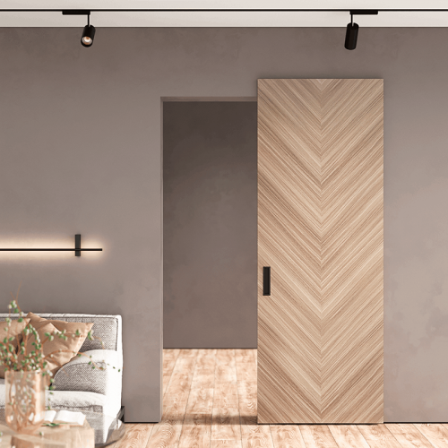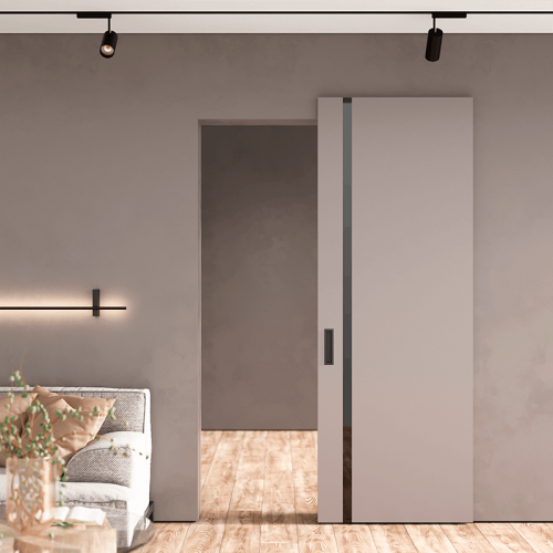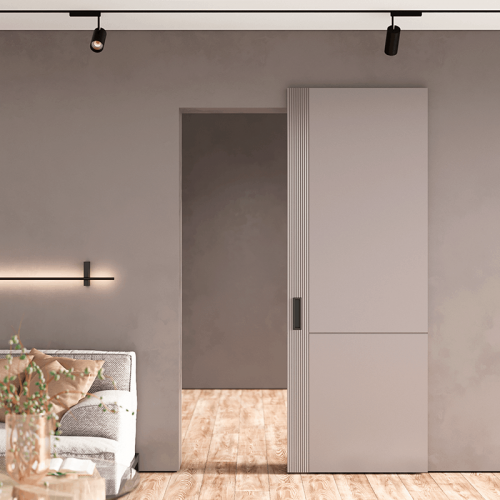 Отличительная черта — в особом механизме открывания, который основан на системе направляющих, скрытых непосредственно внутри дверного полотна. Они обеспечивают плавное и бесшумное скольжение двери, а роликовые каретки равномерно распределяют нагрузку, что повышает износостойкость конструкции. Отсутствие нижнего рельса сохраняет целостность напольного покрытия, что особенно важно для помещений с единым стилевым решением.