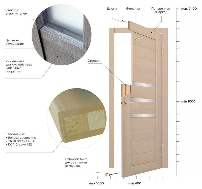 Все межкомнатные модели сборной конструкции делятся на три вида: погонажные, филенчатые и царговые. Первые делают со стеклянной вставкой почти на всю высоту, вторые собираются из филёнок, скреплённых клеевым способом. И тот и другой межкомнатный тип конструкции не всегда надёжен.