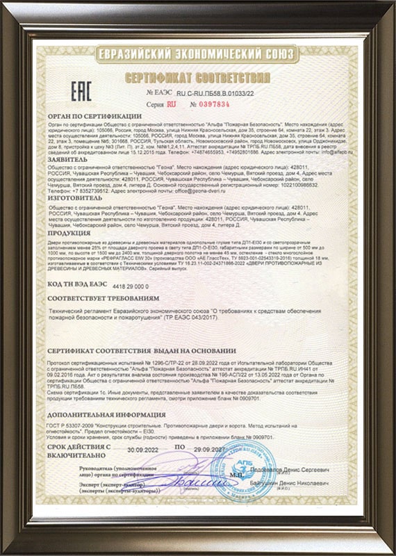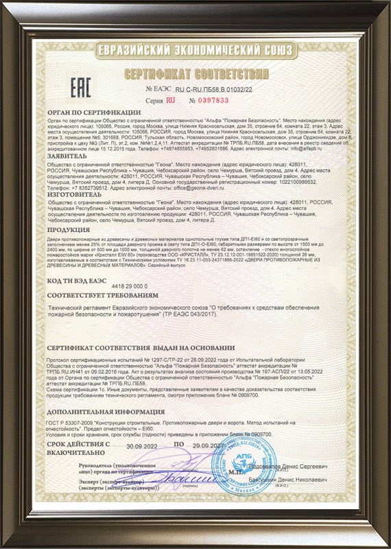 Сертификат соответствия по противопожарным межкомнатным дверям