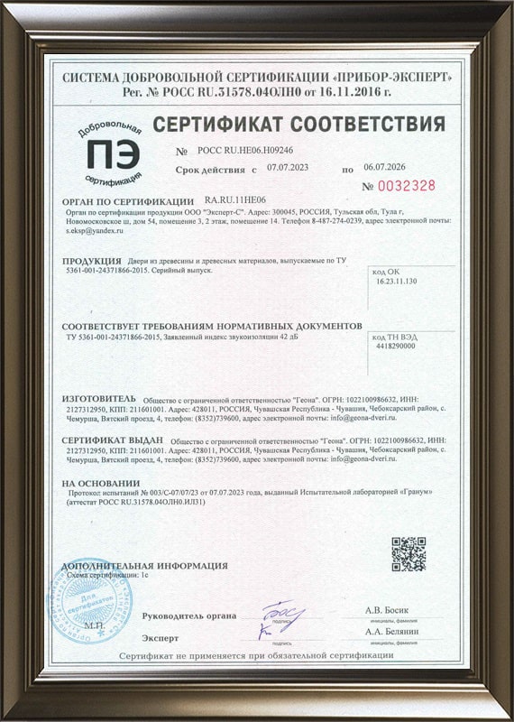 Сертификат соответствия требованиям на звукоизоляционные двери с притвором